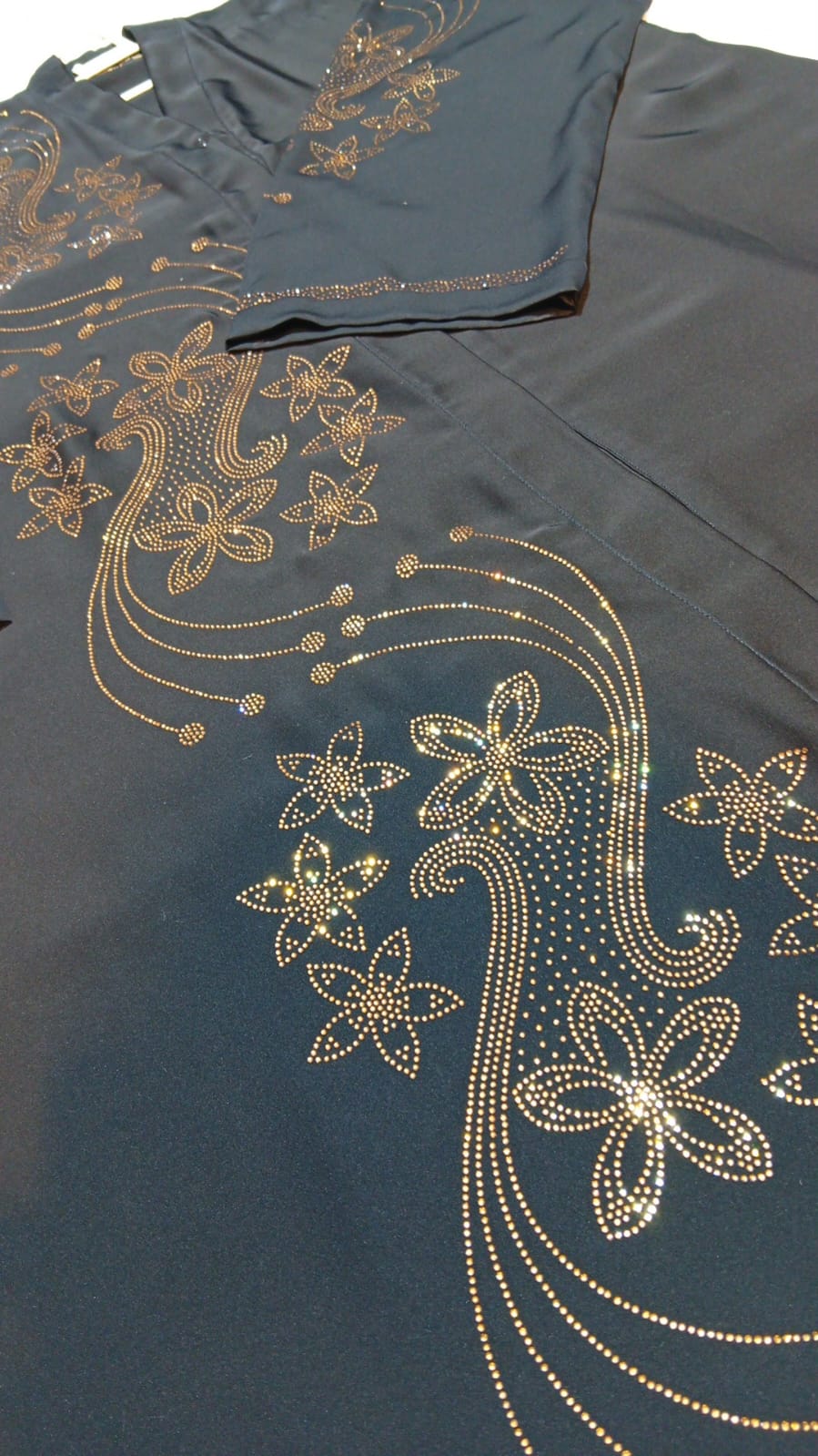 Elegant black abaya crafted from luxurious, smooth fabric that drapes gracefully for a flattering silhouette. The design features exquisite gold embellishments with delicate floral motifs and swirling patterns of shimmering beads and stones that sparkle with every movement, adding regal glamour. A subtle V‑neckline enhances the sophisticated style, making this piece a versatile showcase of traditional elegance blended with modern luxury—perfect for any special occasion.